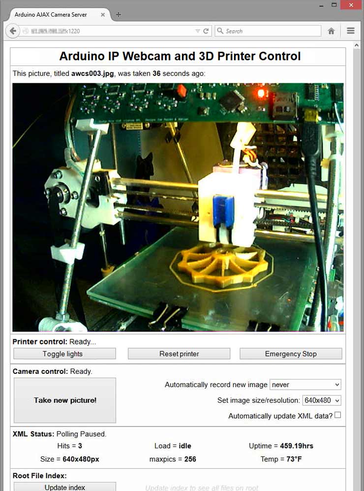 XML status lists additional XML data send by the Arduino. This includes local temperature, uptime, server load, a hit counter, most recent image size, and the maximum pictures allowed on the SD card before being overwritten.
