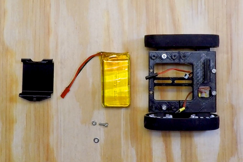 For the basic RC version, we just stuck a 2S, 800mAh LiPo into the middle of the robot. The high center of gravity however made it relatively easy to roll over.